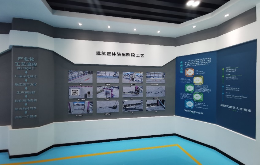 裝配式建筑科技文化展示中心,具有科學(xué)普及與專業(yè)認知、教學(xué)模塊開發(fā)與實施功能。含裝配式建筑發(fā)展史、標(biāo)志性裝配式建筑展示、新技術(shù)新工藝展示、專利工法展示、裝配式構(gòu)件建筑全息投影模型等。通過文字、圖片、模型和多媒體等方式,展示裝配式建筑的發(fā)展歷史,從多角度揭示建筑在不同的社會文化和歷史條件下各自經(jīng)歷的發(fā)展歷程及其取得的成就。對裝配式建筑工程新工藝、新技術(shù)及時展示宣傳,保證所教知識與時俱進,提高學(xué)生對專業(yè)的認知。